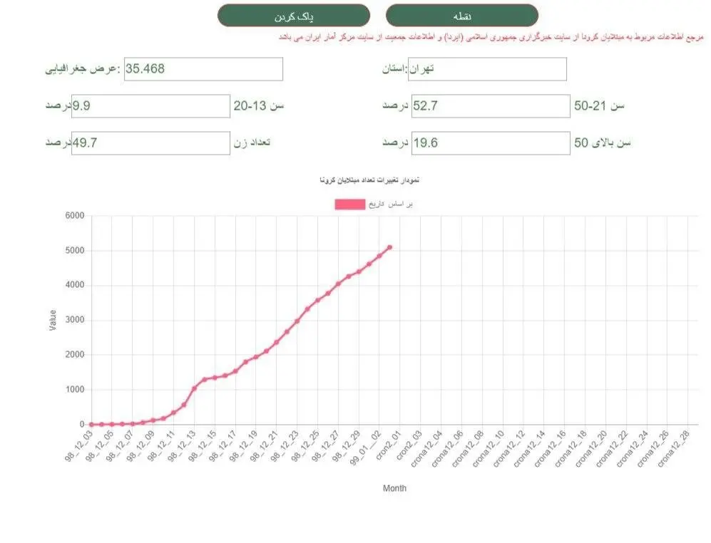 در این نمودار رشد ابتلا به ویروس کرونا در تهران را مشاهده میکنید که حاکی از سرعت رشد ابتلا به این ویروس است که در سه روز ابتدایی سال ۱۳۹۹ شمار آنها از مرز ۵۰۰۰ نفر در پایتخت گذشته است.