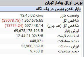 شاخص کل با افت ۲۹ هزار و ۷۸ واحدی به ارتفاع ۱,۹۶۷,۶۷۷ واحد رسید. شاخص هم وزن نیز با ۱.۹۴ درصد کاهش به سطح ۶۹۷ هزار و ۴۵۰ واحدی رسید. شاخص فرابورس با کاهش ۴۶۸ واحدی به ۲۵ هزار و ۹۶۲ واحد رسید.