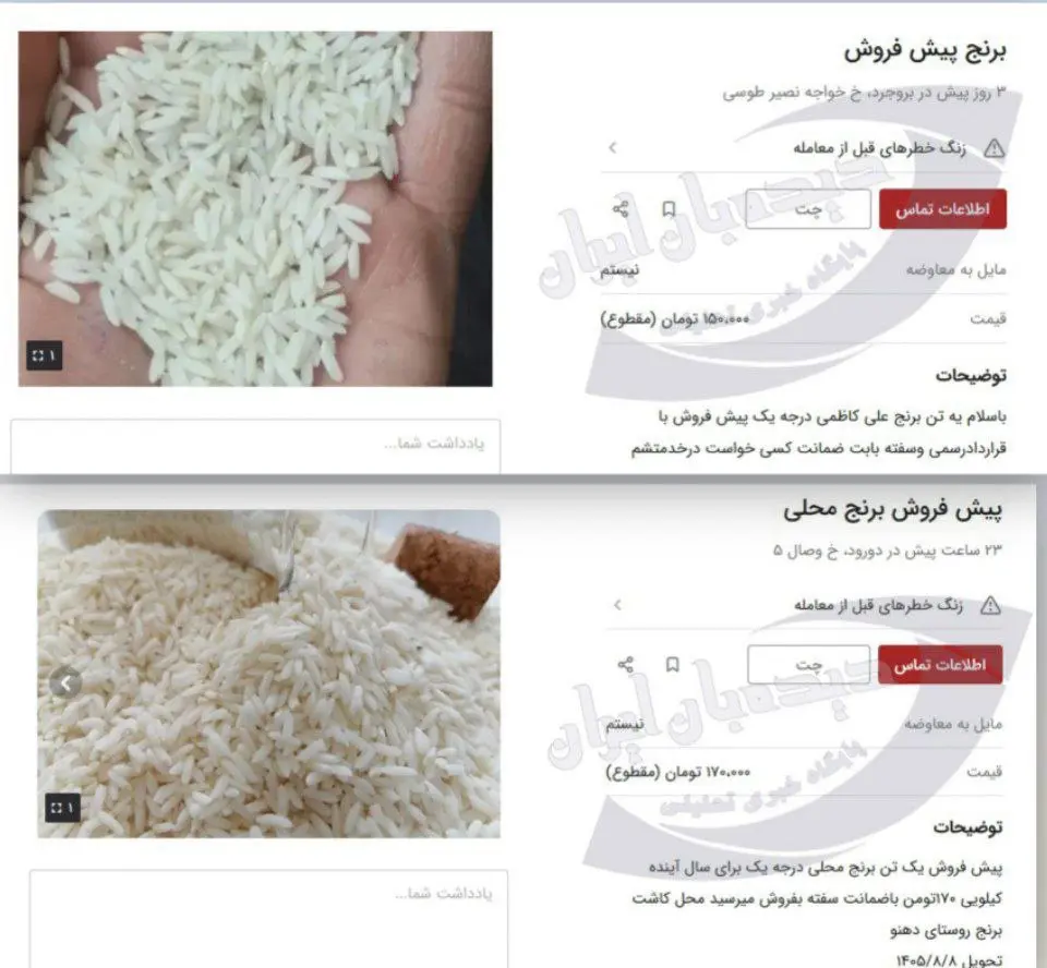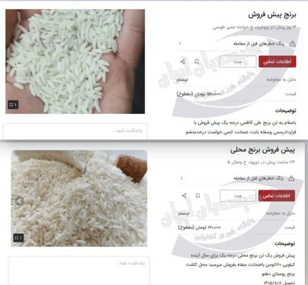 به عنوان مثال فردی پیش فروش یک تن برنج محلی با تحویل ۱۴۰۵ را به قیمت کیلویی ۱۷۰ هزار تومان انجام میدهد.