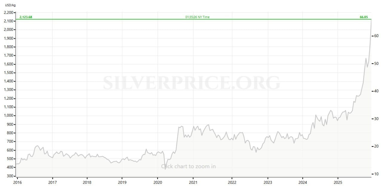 قیمت جهانی نقره در معاملات بامداد امروز با ادامه روند صعودی خود، برای نخستینبار در تاریخ به سطح 66 دلار در هر اونس رسید و رکوردی بیسابقه را ثبت کرد.