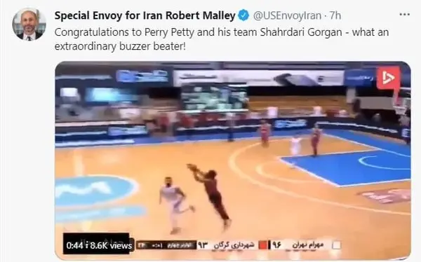 رابرت مالی، مسوول امور در دولت آمریکا، پیروزی تاریخی دیشب شهرداری گرگان و قهرمانی این تیم در لیگبرتر بسکتبال ایران را به آنها و ستاره آمریکاییشان، پری پتی، تبریک گفته است.