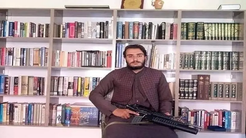 عکس یادگاری عضو طالبان با اسلحه در کتابخانه امرالله صالح در پنجشیر