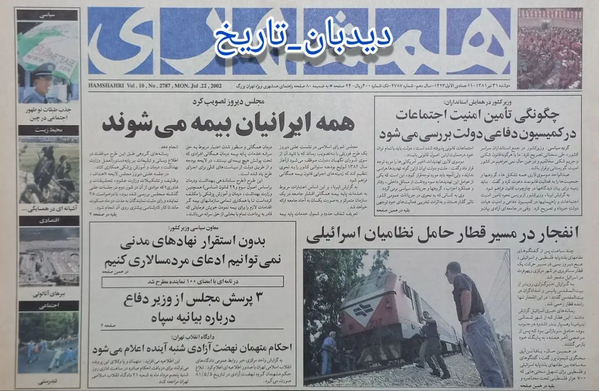 به گزارش دیدبان تاریخ؛ صفحه نخست روزنامه همشهری ۲۰ سال قبل امروز دوشنبه ۳۱ تیر سال ۱۳۸۱ را مشاهده می کنید که در ۲۴ صفحه و به قیمت ۴۰۰ ریال و در تیراژ ۴۶۰ هزار نسخه منتشر شده بود.