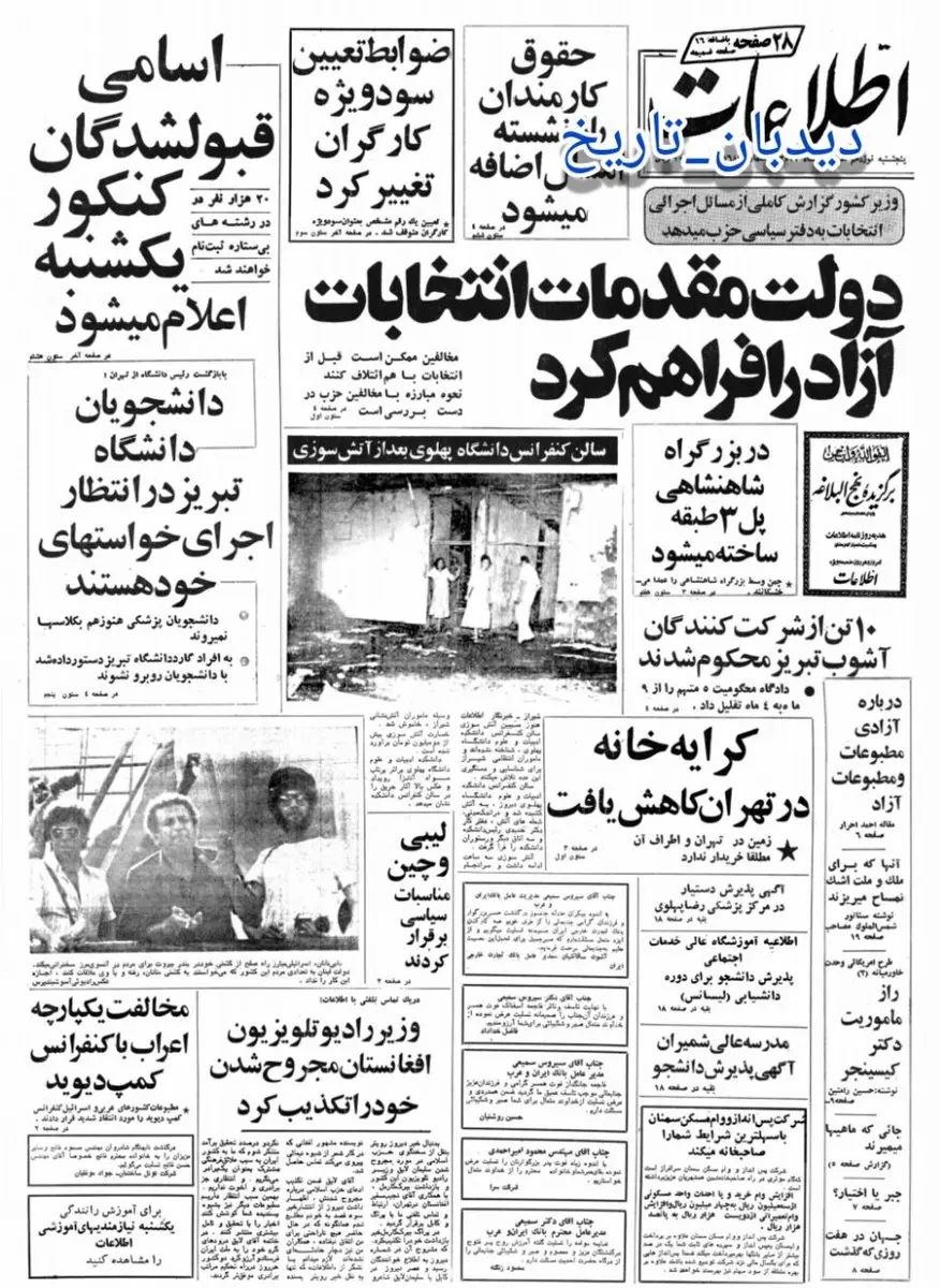 دولت مقدمات انتخابات آزاد را فراهم کرده است. این خبری است به نقل از وزیر کشور که به عنوان تیتر یک روزنامه امروز انتخاب شده است. از جمله تیترهای مهم دیگر امروز روزنامه میتوان به افزایش حقوق کارمندان بازنشسته از امسال، آتش سوزی در سالن کنفرانس دانشگاه پهلوی، کاهش کرایه خانه در تهران و اینکه زمین در تهران و اطراف آن مطلقا خریدار ندارد به همراه خبر احداث پل ۳ طبقه در بزرگراه شاهنشاهی و محکوم شدن ۱۰ تن از شرکت کنندگان در آشوبهای تبریز اشاره کرد. روزنامه را ورق زده و به صفحه چهارم که مربوط به اخبار داخلی است می رویم. باز شدن سینماها پس از چند روز اعتصاب و تظاهرات در چند منطقه تهران از جمله خبرهای جالب توجه این صفحه است که متن کامل هر دو خبر فوق بدین شرح است؛