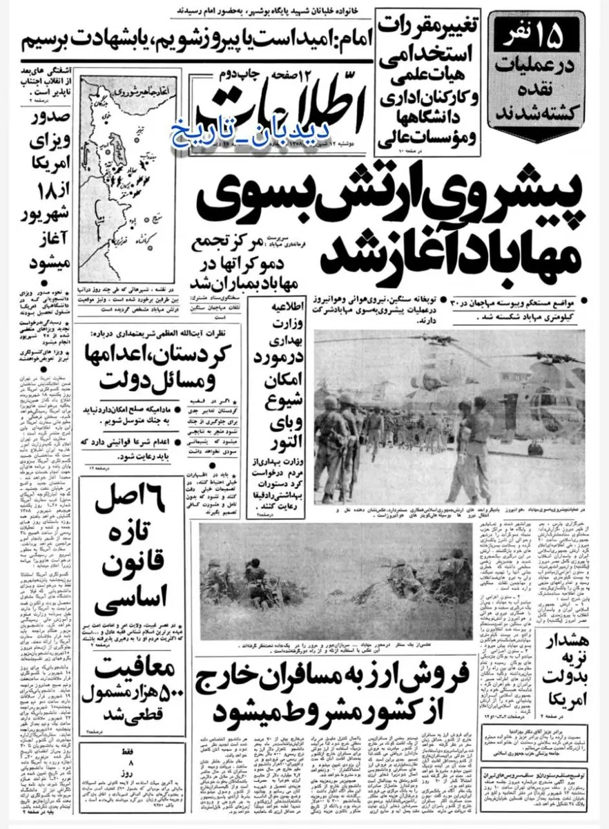 به گزارش سایت دیده بان ایران؛ پیشروی ارتش به سوی مهاباد آغاز شد و مرکز تجمع دموکراتها در مهاباد بمباران شد و ۱۵ نفر در عملیات نقده کشته شدند. این تیترها از بارزترین تیترهای صفحه نخست روزنامه اطلاعات در روز دوشنبه ۱۲ شهریور سال ۱۳۵۸ هستند. تغییرات در مقررات استخدامی هیات علمی و کارکنان اداری دانشگاهها و موسسات عالی و آغاز صدور ویزای آمریکا از ۱۸ شهریور و مشروط شدن فروش ارز به مسافران خارج از کشور در کنار هشدار وزارت بهداری در مورد امکان شیوع وبای التور در کشور از جمله خبرهای دیگر این شماره روزنامه هستند.