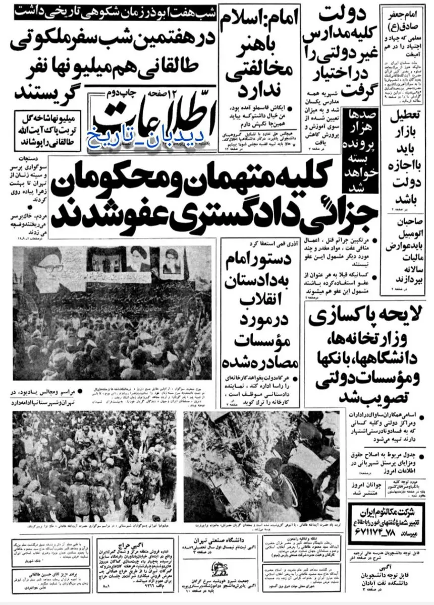 به گزارش دیدبان تاریخ؛ روز یکشنبه ۲۵ شهریور سال ۱۳۵۸ است. روزنامه ۱۲ صفحه ای اطلاعات در چاپ دوم امروز خود در تیتر یک از عفو کلیه متهمان و محکومان جزائی دادگستری خبر داده و اینکه با این عفو صدها هزار پرونده بسته خواهد شد. اما مرتکبین جرائم قتل، اعمال منافی عفت، مواد مخدر و چند مورد دیگر مشمول این عفو نیستند. تیتر مهم دیگر روزنامه اختصاص دارد به مراسم شب هفت مرحوم آیت الله طالقانی و تصاویری از این مراسم در تهران و شهرستانها و اینکه میلیونها شاخه گل تربت پاک آیت الله را پوشانده بود. نقل قولی از امام خمینی مبنی بر اینکه اسلام با هنر مخالفتی ندارد و هیچکس حق ندارد با تشکیل گروههای دانشجویی یا غیره در کار دانشگاهها اخلال ایجاد کند در بالای صفحه روزنامه خودنمایی می کند. از جمله تیترهای مهم صفحه یک میتوان به تصویب لایحه پاکسازی وزارتخانه ها، دانشگاهها، بانکها و موسسات دولتی و در اختیار قرار گرفتن کلیه مدارس غیردولتی توسط دولت و یکسان شدن شهریه همه آنها به نقل از محمدعلی رجائی سرپرست وزارت آموزش و پرورش و همچنین به نقل از صادق طباطبائی سخنگوی دولت پرداخت عوارض سالیانه توسط صاحبان خودروها از این به بعد اشاره کرد.