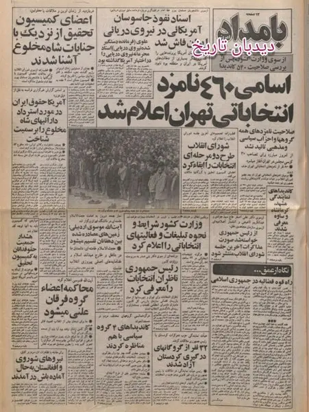 به گزارش سایت دیدهبان ایران؛ اعلام اسامی ۴۶۰ نامزد انتخاباتی تهران از سوی وزارت کشور پس از بررسی صلاحیت ۵۴۰ کاندیدا و آغاز مبارزه برای تصاحب ۳۰ کرسی مجلس در تهران از امروز، تیتر یک روزنامه بامداد امروز در ۴۴ سال قبل، شنبه ۱۱ اسفند سال ۱۳۵۸ است. همچنین رئیس جمهور بنی صدر طی نامه ای به سرپرست وزارت کشور، ناظران انتخابات را معرفی کردند. آیت الله قدوسی هم اعلام کرده اند که محاکمه اعضاء گروه فرقان علنی می شود و اینک ما برای دینمان بیش از انقلاب اهمیت قائل هستیم. آیت الله موسوی اردبیلی هم در سخنرانی پیش از خطبه های نماز جمعه تهران گفته اند؛ زمین های مصادره شده بین دهقانان تقسیم می شود. در بازدید از زندان اوین و ملاقات با معلولین هم اعضای کمیسیون تحقیق از نزدیک با جنایات شاه مخلوع آشنا شدند و همچنین بر اساس گزارش خبرگزاری فرانسه، آمریکا حقوق ایران در مورد استرداد دارائیهای شاه مخلوع را به رسمیت شناخت. از سوی دانشجویان مسلمان پیرو خط امام نیز اسناد نفوذ جاسوسان آمریکایی در نیروی دریایی ایران فاش شده است. به صفحه دوم روزنامه می رویم به خبری درباره تجدیدنظر در پاکسازی ادارات برخورد می کنیم که متن این خبر به شرح زیر است؛