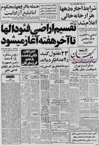 به گزارش سایت دیده بان ایران؛ آغاز تقسیم اراضی فئودالها تا آخر هفته بعد به نقل از دکتر رضا اصفهانی تیتر یک امروز روزنامه کیهان روز یکشنبه ۱۲ اسفند سال ۱۳۵۸ است. اعلام شرایط اجاره دهها هزار خانه خالی هم تیتر مهم دیگر آن است. کیهان از اعترافات تکان دهنده ۸ عضو گروه فرقان نوشته و از رئوس مناظره ۴/۵ ساعته رئیس جمهور بنی صدر با سازمان چریکهای فدایی خلق خبر داده است. آیت الله مهدوی کنی سرپرست وزارت کشور هم اعلام کرده است که حمله گروهها محکوم اما تبلیغات آزاد است. تیتر دیگر کیهان به ملی شدن سردخانه های بزرگ اختصاص دارد و موفقیت آمیز بودن مذاکرات هیات حزب دمکرات در تهران خبر دیگر آن است.