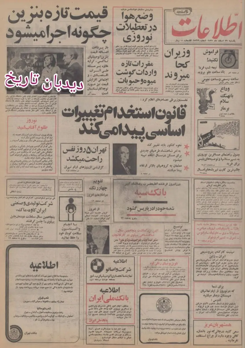 به گزارش سایت دیدهبان ایران؛ روزنامهها تا سال ۵۷ در روز ۲۹ اسفند هم منتشر می شدند اما بعد از پیروزی انقلاب و از سال ۵۸ که این روز بعنوان روز ملی شدن صنعت نفت تعطیل رسمی اعلام گردید در طول سالهای بعد از انقلاب نهایتا تا روز ۲۸ اسفند منتشر می شدند. به دو سال قبل از پیروزی انقلاب می رویم، روز یکشنبه ۲۹ اسفند سال ۱۳۵۵ و سراغ روزنامه ۴۰ صفحه ای اطلاعات که به قیمت ۱۰ ریال منتشر شده بود. اولین نوشته ای که در زیر لوگوی روزنامه به چشم می آید این است؛ فراموش نکنید! نیمه شب فردا یک ساعت جلو بروید که اشاره به یکساعت جلو رفتن ساعتها بود.
