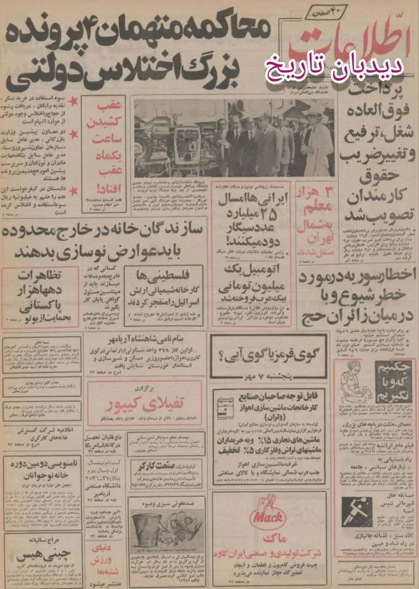محاکمه متهمان ۴ پرونده اختلاس دولتی، تیتر یک شماره روز سه شنبه ۲۹ شهریور سال ۱۳۵۶ روزنامه ۴۰ صفحه ای اطلاعات است. این روزنامه در سوتیتر مربوط به این خبر آورده است که سوءاستفاده در خرید شکر، تغذیه رایگان، دریافت رشوه از حجاج و اختلاس وجوه دولتی از موارد اتهام است. و دادستان در کیفرخواست، این عده را متهم به میلیونها ریال سوءاستفاده و اختلاس کرده است. عکس یک روزنامه هم به بازدید شاه و فرح پهلوی از نمایشگاه بین المللی تهران اختصاص دارد.