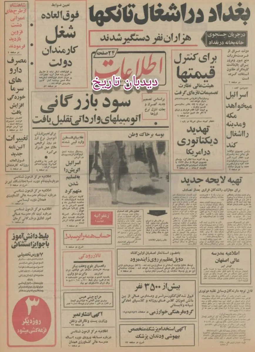 صفحه نخست روزنامه اطلاعات روز یکشنبه ۸ مهر سال ۱۳۵۲ پیش روی شماست. آخرین اخبار از بغداد پایتخت عراق تیتر یک آن است. این شهر در اشغال تانکهاست و هزاران نفر هم دستگیر شدند. کمیته سنای آمریکا هم با ارسال اخطاریه ای از تهدید دیکتاتوری در آمریکا خبر داده و اینکه روسای جمهور آمریکا از سال ۱۹۳۳ با اختیارات شبیه رژیم های دیکتاتوری حکومت کرده اند.