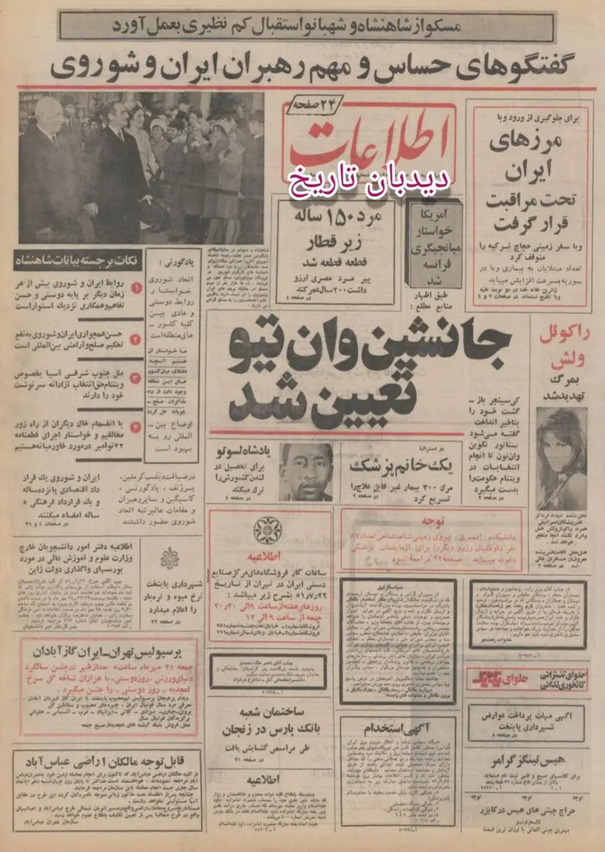 گفتگوهای حساس و مهم رهبران ایران و شوروی در استقبال کم نظیر مسکو از شاهنشاه و شهبانو، تیتر یک شماره امروز چهارشنبه ۱۹ مهر سال ۱۳۵۱ روزنامه اطلاعات است. پادگورنی صدر هیات رئیسه اتحادیه جماهیر شوروی در این دیدار خواستار روابط دوستی و عادی بین کلیه کشورهای منطقه شده و ایران و شوروی قرار است در این سفر یک قرارداد اقتصادی ۱۵ ساله و یک قرارداد فرهنگی ۵ ساله امضاء کنند. شاه هم گفته است روابط ایران و شوروی بیش از هر زمان دیگری بر پایه دوستی وحسن تفاهم و همکاری نزدیک استوار است. عکس یک روزنامه هم به همین سفر اختصاص یافته است. به صفحه آخر روزنامه می رویم به خبری با عنوان احداث کارخانه تولید برق اتمی و شیرین کردن آب بر میخوریم که متن این گزارش به شرح زیر می باشد؛