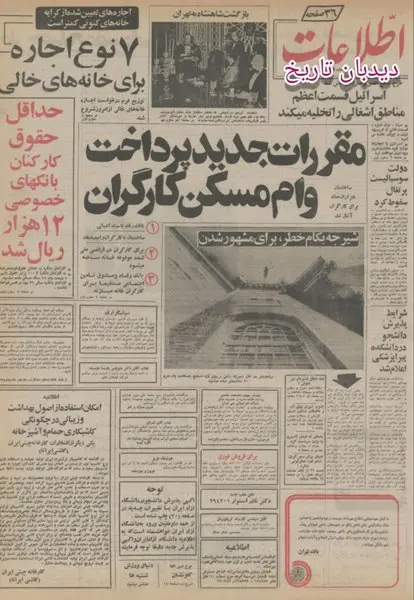 به گزارش سایت دیده بان ایران؛ مقررات جدید پرداخت وام مسکن کارگران و آغاز ساخت هزاران خانه برای کارگران، تیتر یک شماره امروز پنجشنبه ۱۷ آذر سال ۱۳۵۶ روزنامه اطلاعات است.