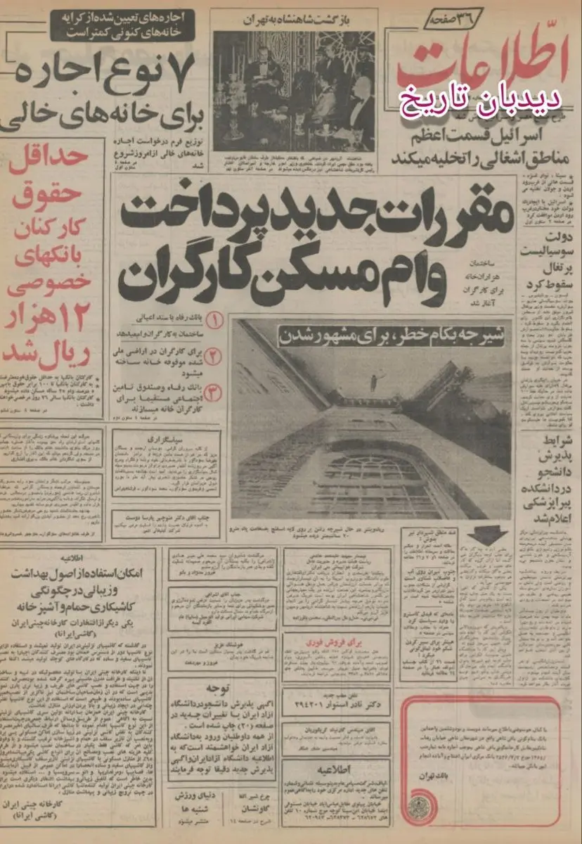 مقررات جدید پرداخت وام مسکن کارگران و آغاز ساخت هزاران خانه برای کارگران، تیتر یک شماره امروز پنجشنبه ۱۷ آذر سال ۱۳۵۶ روزنامه اطلاعات است. اطلاعات، در تیتری دیگر از تعیین ۷ نوع اجاره برای خانه های خالی نوشته و از توزیع فرم درخواست اجاره خانه های خالی از امروز خبر داده است. تیتر قرمز این شماره اطلاعات هم اختصاص دارد به تعیین ۱۲ هزار ریال بعنوان حداقل حقوق کارکنان بانکهای خصوصی. این روزنامه همچنین با چاپ عکسی از بازگشت محمدرضا پهلوی از سفر عمان و تلاش وی برای صلح در خاورمیانه خبر داده است. فاش شدن طرح صلح مصر و اسرائیل خبر دیگر آن است که طبق آن، اسرائیل قسمت اعظم مناطق اشغالی را تخلیه می کند که شبه جزیره سینا، نوار غزه، قسمتهایی از غرب رود اردن و جولان از جمله آنهاست.