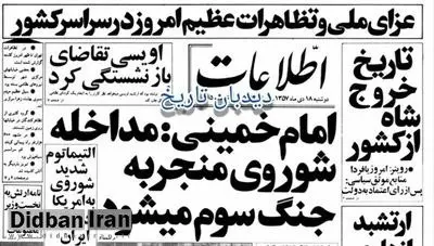 به گزارش سایت دیدهبان ایران؛ صفحه نخست روزنامه اطلاعات مورخه دوشنبه ۱۸ دی سال ۱۳۵۷ را مشاهده می کنید. تیتر اول روزنامه اختصاص دارد به سخنان امام خمینی درباره عواقب دخالت شوروی در حوادث ایران که منجر به جنگ جهانی سوم میشود. از سویی دیگر، شوروی به آمریکا درباره عواقب دخالت در حوادث ایران هشدار داده است. تعیین تاریخ خروج شاه از کشور، خبر خروج ارتشبد ازهاری از ایران، نامه ارتش به نخست وزیری درباره مطبوعات و تقاضای بازنشستگی اویسی از جمله تیترهای شاخص بعدی این جریده عصرگاهی هستند. در صفحه آخر روزنامه به دو تحلیل از دو خبرگزاری خارجی درباره رخدادهای ایران بر می خوریم که در ادامه ملاحظه می فرمایید: