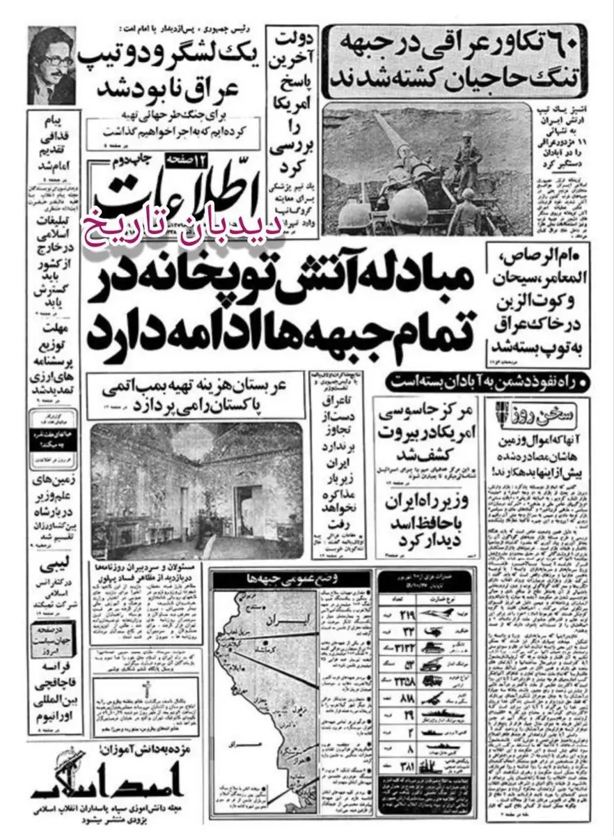 به گزارش سایت دیده بان ایران؛ صفحه نخست روزنامه اطلاعات روز یکشنبه ۲۸ دی سال ۱۳۵۹ را مشاهده می نمایید. این روزنامه در تیتر یک خود، آخرین خبرها از جبهه های جنگ را کار کرده است و آن ادامه دار بودن آتش توپخانه در تمام جبهه هاست. این روزنامه خبر داده که راه نفوذ دشمن به آبادان بسته است و ۶۰ تکاور عراقی در جبهه تنگ حاجیان کشته شوند. رئیس جمهور بنی صدر هم پس از دیدار با امام اعلام کرد که یک لشگر و دو تیپ عراق نابود شده و برای جنگ طرحهایی تهیه کرده ایم که به اجرا خواهیم گذاشت. از آخرین اخبار درباره گروگانهای آمریکایی هم اینکه دولت ایران، آخرین پاسخ آمریکا را بررسی کرده و یک تیم پزشکی برای معاینه گروگانها وارد تهران شد. پیام قذافی رهبر لیبی تقدیم امام شده و از نتایج مذاکرات اولاف پالمه با رئیس جمهور و نخست وزیر کشورمان این خبر منتشر شده است که تا عراق دست از تجاوز برندارد ایران زیر بار مذاکره نخواهد رفت. همچنین این روزنامه مثل هر روز در نیم تای پایینی خود آخرین وضع عمومی جبهه ها و میزان خسارات عراق را در دو باکس جداگانه مشخص کرده است.