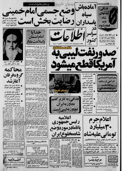 به گزارش سایت دیده بان ایران؛ صفحه نخست روزنامه اطلاعات ۴۵ سال قبل امروز پنجشنبه ۴ بهمن ۱۳۵۸ را مشاهده می کنید که در کنار خبر تائید پزشکان معالج امام امت مبنی بر سلامت جسمی وی، یک خبر دیگر نیز که اختصاصی این جریده است جلب نظر می کند؛ یک مصاحبه اختصاصی با معمر قذافی رهبر انقلاب لیبی که در تاریخ مطبوعات پس از انقلاب بی سابقه بود.