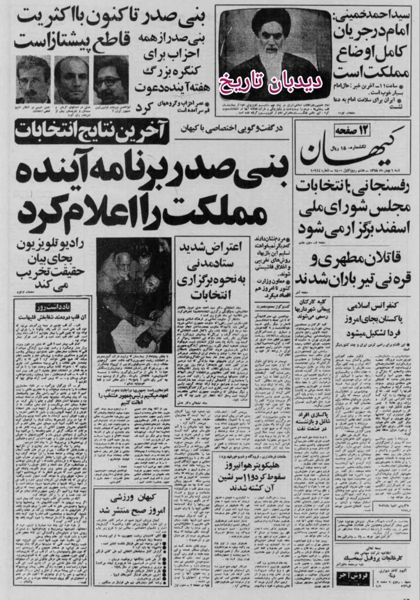 به گزارش سایت دیده بان ایران؛ در پی مشخص شدن نتایج اولیه اولین انتخابات ریاست جمهوری و پیروزی بنی صدر بر رقبا، روزنامه کیهان روز شنبه ۶ بهمن سال ۱۳۵۸ در گفتگویی اختصاصی با بنی صدر از قول وی تیتر زد که بنی صدر برنامه آینده مملکت را اعلام کرد. وی گفته است که مردم نشان دادند که دیگر نمی خواهند تسلیم این بازیها، روشهای تخریبی و اخلاق فاشیستی شوند. او اضافه کرده رادیو و تلویزیون بجای بیان حقیقت تخریب می کنند. بنی صدر از همه احزاب هم برای کنگره بزرگ هفته آینده دعوت کرد و اینکه عصر احزاب و گروههای قم به سر آمده است. نفر دوم انتخابات هم دکتر سید احمد مدنی است که در دو استان کرمان و سیستان و بلوچستان از بنی صدر رای بیشتری آورده است. ستاد دکتر مدنی هم در اطلاعیه ای که سوژه امروز " روزنامه گردی دیدبان تاریخ " است به نحوه برگزاری انتخابات اعتراض کرده است. اما خبر دیگر روزنامه به مساعد بودن حال رهبر انقلاب از قول سید احمد خمینی اختصاص دارد. هاشمی رفسنجانی وزیر کشور هم اعلام کرده است که انتخابات مجلس شورای ملی اسفند امسال برگزار میشود و خبر آخر هم اینکه قاتلان مطهری و قره نی تیر باران شدند.