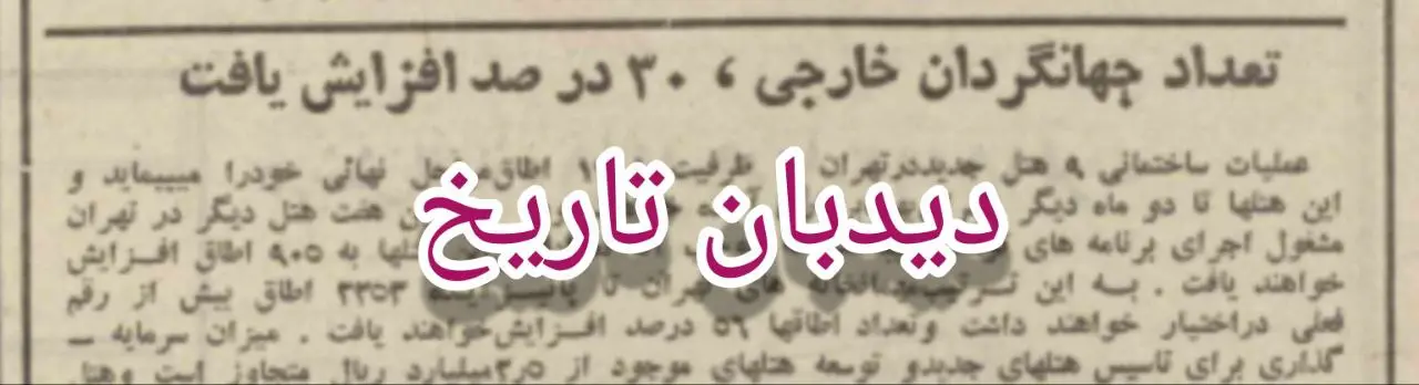 صفحه نخست کیهان ۲۴ صفحه ای روز سه شنبه ۱۸ خرداد سال ۱۳۵۰ پیش روی شماست. تعداد جهانگردان خارجی ۳۰ درصد افزایش یافت. عنوان گزارش تفصیلی کیهان درباره رونق گردشگری در ایران است. در این گزارش نوشته شده: عملیات ساختمانی ۹ هتل جدید در تهران با ظرفیت ۱۳۴۸ اتاق، مراحل نهایی خود را می پیماید و این هتل ها تا دو ماه دیگر برای بهره برداری آماده خواهند بود. همچنین هفت هتل دیگر در تهران مشغول اجرای برنامه های توسعه می باشند که بموجب آن تعداد اتاق این هتلها به ۹۰۵ اتاق افزایش خواهند یافت. به این ترتیب مهمانخانه های تهران تا پاییز ۲۳۵۳ اتاق بیش از رقم در اختیار خواهند داشت و تعداد اتاقها ۵۶ درصد افزایش خواهند یافت. میزان سرمایه گذاری برای تاسیس هتلهای جدید و توسعه هتلهای موجود از ۲/۵ میلیارد ریال متجاوز است