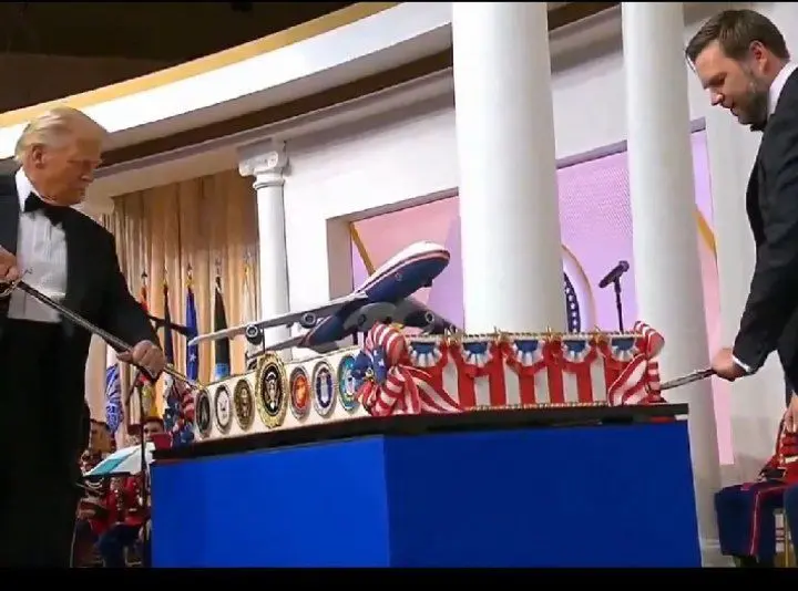 دونالد ترامپ، رئیسجمهوری آمریکا در مراسم بریدن کیک تحلیف در حالی که برای بریدن کیک شمشیری در دست داشت، حرکتهای رقص مشهور خود را با آهنگ محبوبش، وایامسیآی، اجرا کرد. ملانیا ترامپ، بانوی اول آمریکا نیز در بخشهایی او را همراهی کرد. در کنار آنها جیدی ونس، معاون ترامپ و همسرش دیده میشوند.