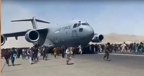 نظامیان آمریکایی در حال فرار از افغانستان هستند؛ مردم تلاش می کنند سوار هواپیمای نظامی آمریکا که در حال فرار است شوند