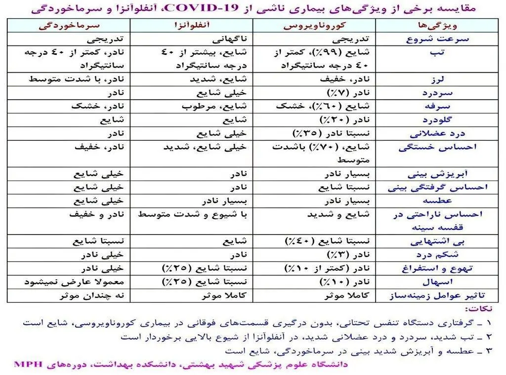 کرونا با این علائم و نشانه ها بروز می کند/ مقایسه کرونا با سرما خوردگی و آنفولانزا جدول مقایسه علام و نشانه های کرونا با آنفولانزا و سرما خوردگی