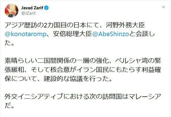 وزیر خارجه کشورمان پس از گفتوگوهای سازنده خود با مقامات ارشد ژاپنی توییتی به زبان ژاپنی منتشر کرد.