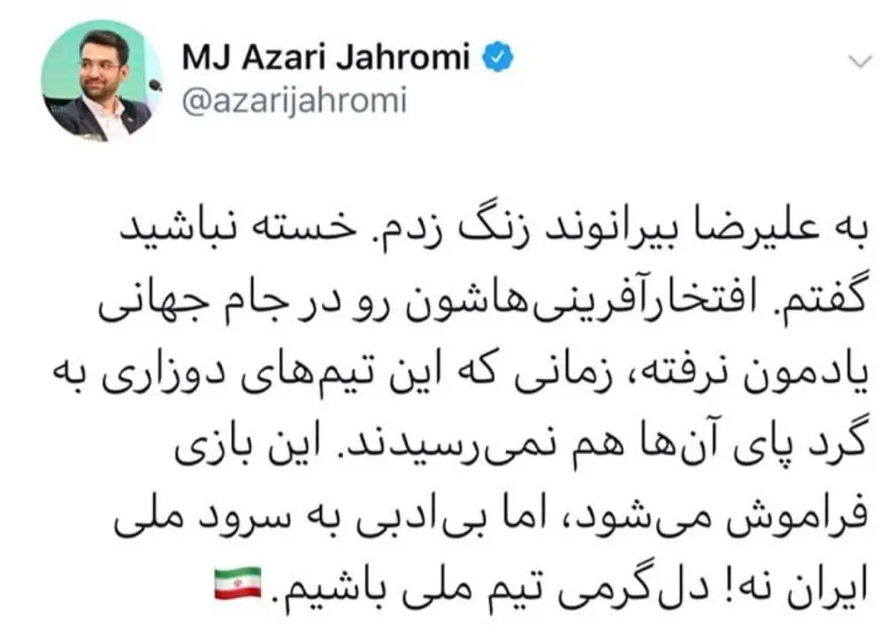 آذری جهرمی در تماسی به علیرضا بیرانوند روحیه داده و گفته بود، زمانی این تیمهای دوزاری به گرد پای ما هم نمیرسیدند.