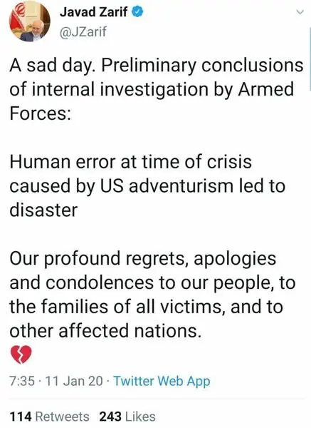 روزی غمانگیز. نتایج اولیه تحقیقات داخلی توسط نیروهای مسلح: اشتباه انسانی در زمان بحران ناشی از ماجراجویی ایالات متحده به فاجعه منجر شد. عرض تأسف عمیق، پوزش و تسلیت ما به مردم ما، خانوادههای قربانیان و همه ملتهای آسیب دیده."