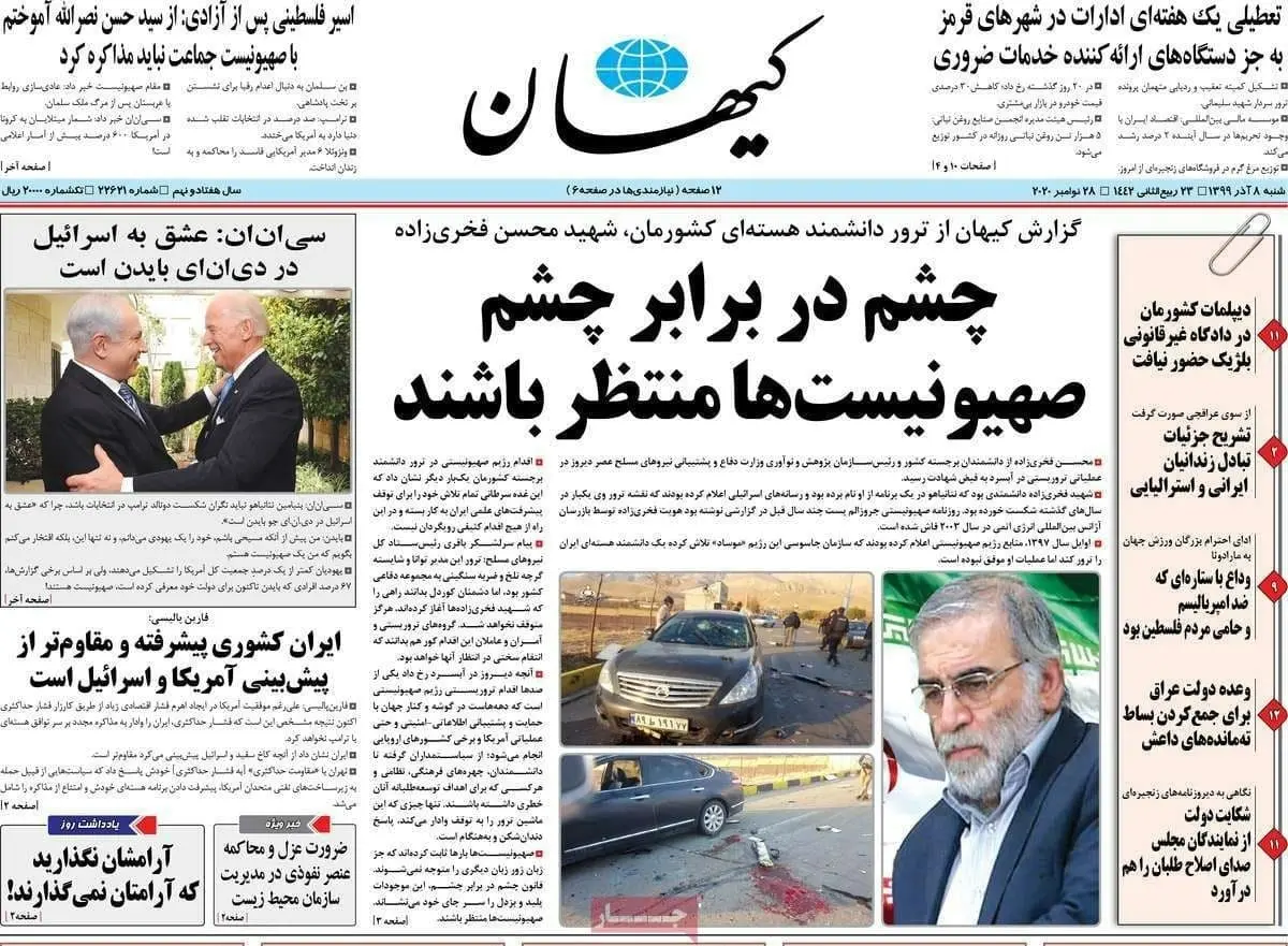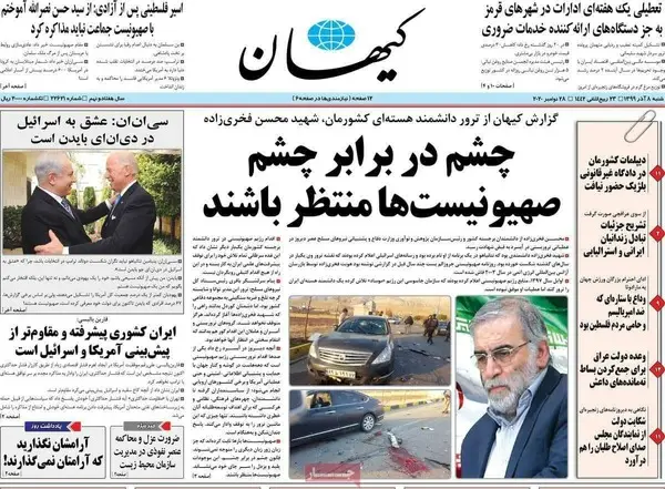 به گزارش سایت دیده بان ایران؛ روز گذشته محسن فخری زاده از دانشمندان ایرانی صنایع دفاعی کشور ترور شد و به شهادت رسید. روزنامه کیهان در واکنش به این رور تیتر صفحه اول خود را به این موضوع اختصاص داده و نوشته است؛« چشم در برابر چشم؛ صهیونیست ها منتظر باشند»