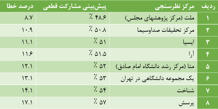 در جدول زیر، پیش بینی مراکز مختلف نظرسنجی به همراه درصد خطای آنها (به ترتیب کمترین خطا) آمده است.